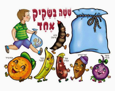 Но самое интересное вас ждет в сказке "שישה בשקיק אחד", которую рассказывают на Ту-би-Шват. Она вам напомнит сказку "Теремок", только дело происходит не в рукавице, а в прозрачном пакете, а вместо зверей пристанище ищут сухофрукты (פירות יבשים):